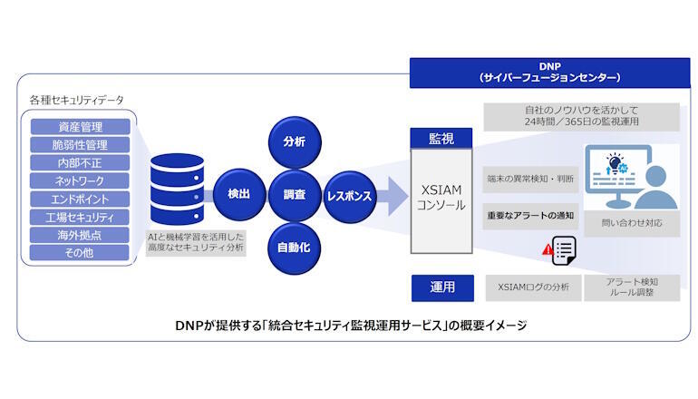 同サービスは、パロアルトネットワークスのCortex® XSIAMとPrisma® Accessを組合わせたものであり、昨年10月から提供中の「エンドポイント監視運用サービス」を拡張する――。DNPが自社で約45,000台の情報端末を監視・運用してきた実績と、新サービスの先行活用で得たノウハウを基盤に、より広範囲でより高度なセキュリティ運用を実現する。