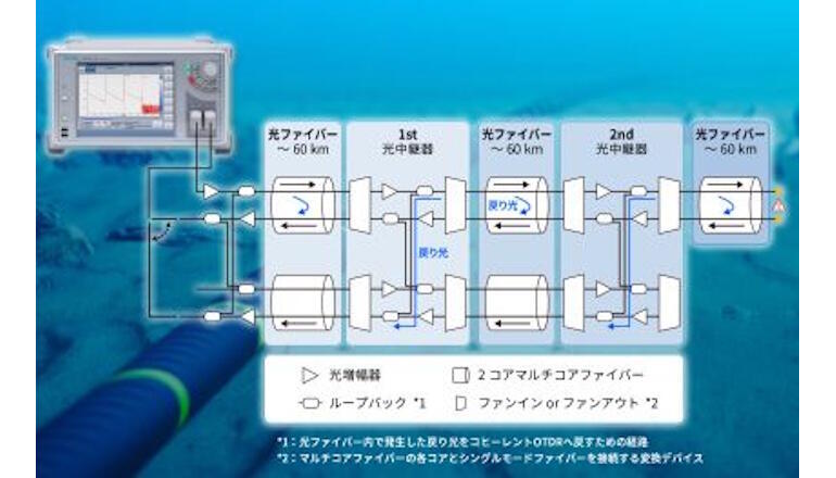 従来、マルチコア光ファイバを用いた光海底ケーブルシステムでの光伝送路特性の測定は困難だったという。アンリツとKDDI総合研究所は、マルチコア光ファイバを用いた次世代の光海底ケーブルの遠隔監視システムを設計・構築し、その試験環境において光パルス試験器「コヒーレントOTDR MW90010B」を用い、光海底ケーブルの運用・保守に必要な障害位置特定や損失分布の計測など、世界初だとする、光伝送路特性の測定に成功した。