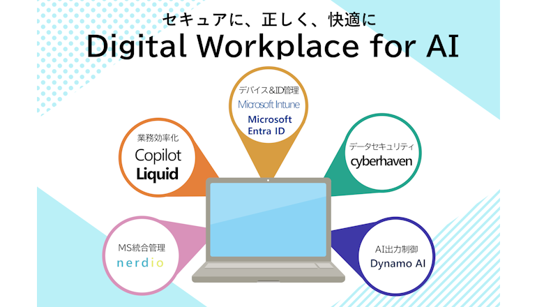 生成AIを活用した自動翻訳や画像生成など業務の効率化の支援、企業データの不正利用を検出し遮断するセキュリティ機能、ハルシネーション(幻覚)を検知して抑制する機能、一元的なユーザー認証基盤などを提供し、企業のセキュリティポリシーに沿ったゼロトラストセキュリティが実施できる。AI PCにデータを残さないデータレスクライアント化や仮想デスクトップ構成も可能だ。
