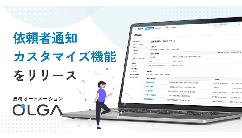 「OLGA」は、依頼受付から契約管理・ナレッジ活用まで、法務業務を一気通貫で自動化する。外部ツールとの柔軟な連携により、従来バラバラに管理されていた情報や業務フローを統合し、「人にしかできない判断」に集中できる仕組みづくりを支援する。今回の新機能により、企業ごとの運用ルールやコミュニケーション文化に合わせた柔軟な通知設定を可能にすることで、法務・事業部門間の円滑な連携を促進し、スムーズな法務DXの推進に貢献するという。