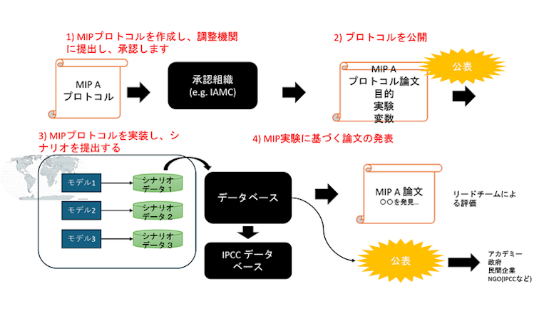 その流れは4段階に整理される。①モデル比較研究の内容の提案とその承認、②モデル比較実験のプロトコルの公開、③実際のモデル比較実験とそのデータ提出、④結果のチェック修正を経て公開――分析や品質チェックを経た成果は政府や企業、市民社会、教育現場等が活用できる形で提供される。