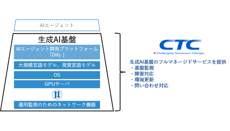 ノーコードでAIエージェントを開発できる「Dify」も実装していて、誰でも迅速に自社業務特化型AIエージェントを開発できるという。CTCは、GPUの最適化、オンプレミス環境の設計・構築、基盤の監視や障害対応、ソフトウェアやAIモデルの定期更新も担う。