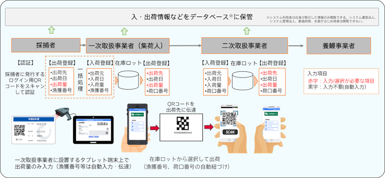 上記流通適正化と事業者の負担軽減に寄与する。同システムでは、各採捕事業者がログイン用QRコード(デンソーウェーブ登録商標)を読み取ることで、届出番号を含む漁獲番号を自動生成できる。ここに取引量を入力すると取引記録が作成され、データベースに保管される。採捕事業者からの一次取扱事業者は次の取引に必要な取引記録のみを参照できるQRコードを発行・伝達。同コードを参照し、容易に記録を確認できる。