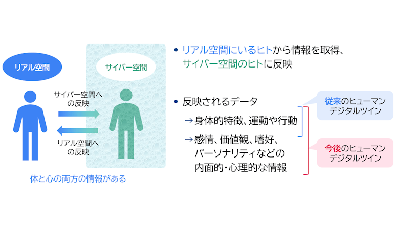 そこでは物理的な身体負荷等のシミュレーションが先行していて、近ごろ心理状態や価値観、パーソナリティー、感情などの人の内面的な情報も反映したHDTのニーズが高まっている。たとえば、HDTを活用してアンケートやインタビューの結果をシミュレーションする場合、個人や集団の傾向や意思決定に至る内面的な情報を反映したHDTが必要であり、同情報を精緻に反映し模擬できれば、実世界の人への調査なしに――