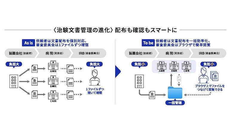 「Clinical Trial Sync」は治験実施医療機関、治験依頼者(製薬企業や開発業務受託機関であるCROなど)、IRBの間で行われる治験関連文書の作成、授受、保管、管理業務を効率化し、今後原則化が見込まれるシングルIRBの円滑な運営を実現する。