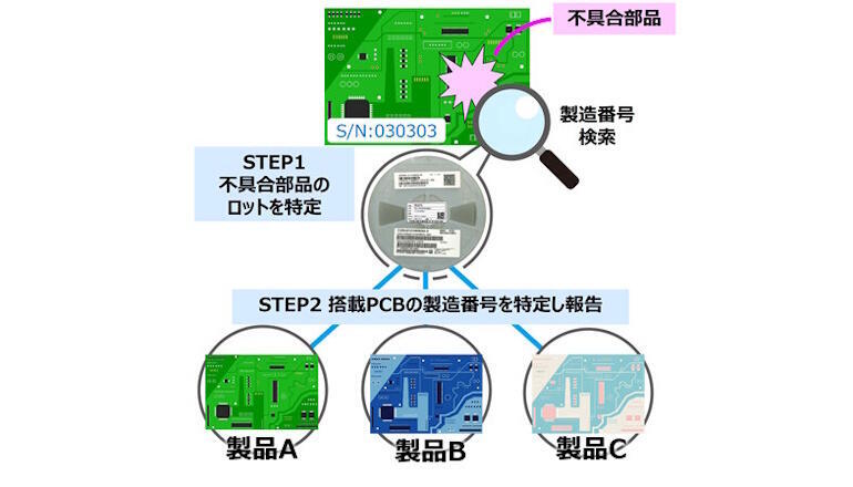 部品ロット番号の控え・テキスト化作業はAI OCRで自動化している。部品のユニークIDをキーにPCB製造番号と部品ロット番号をつなぐことで、上記多種多様な部材・機器製造情報から所要データを抽出し、波及範囲を短期に確定する。複数の同一部品が同じプリント基板にあっても、マウンターデータをリンクすることで、交換が必要な部品の搭載位置まで特定できる。